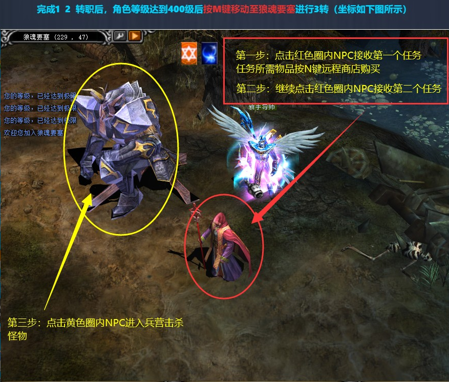 5.别忘了150/220/400级是做1/2/3转任务,任务所需物品按N键打开随身商店购买,当然也可以到400级后一鼓作气,做完所有任务。